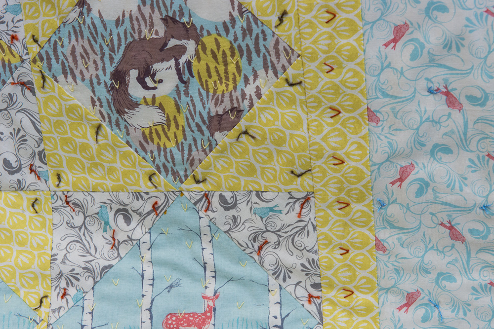I’ve used utility stitches to tie the quilt in a range of cotton perle thread colours: light blue, warm brown, deep orange and a pale yellow for the animal squares, which gives a subtle effect and, of course, these colours echo the colours used in the fabrics too.