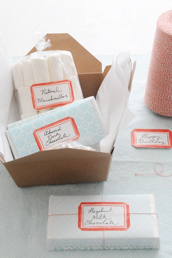I have never had s’mores, but I am willing to bet I would love them! The instructions for making these up are here. This has also turned out to be a great new blog find that I’ve added to my feedly. Of course we don’t have Graham crackers in the UK but my research tells me that they are similar to digestives, so that’s what I’ve gone with. You usually make s’mores on an open fire or bbq, but the instructions for these are to make in the oven. I’m not sure I will follow all the presentation ideas here, but will probably decant the biscuits and the marshmallows into clear cello bags and then put them and the bars of chocolate (I’ve gone for Greene & Black’s organic bars in milk and plain) in a little basket or box with some festive napkins.