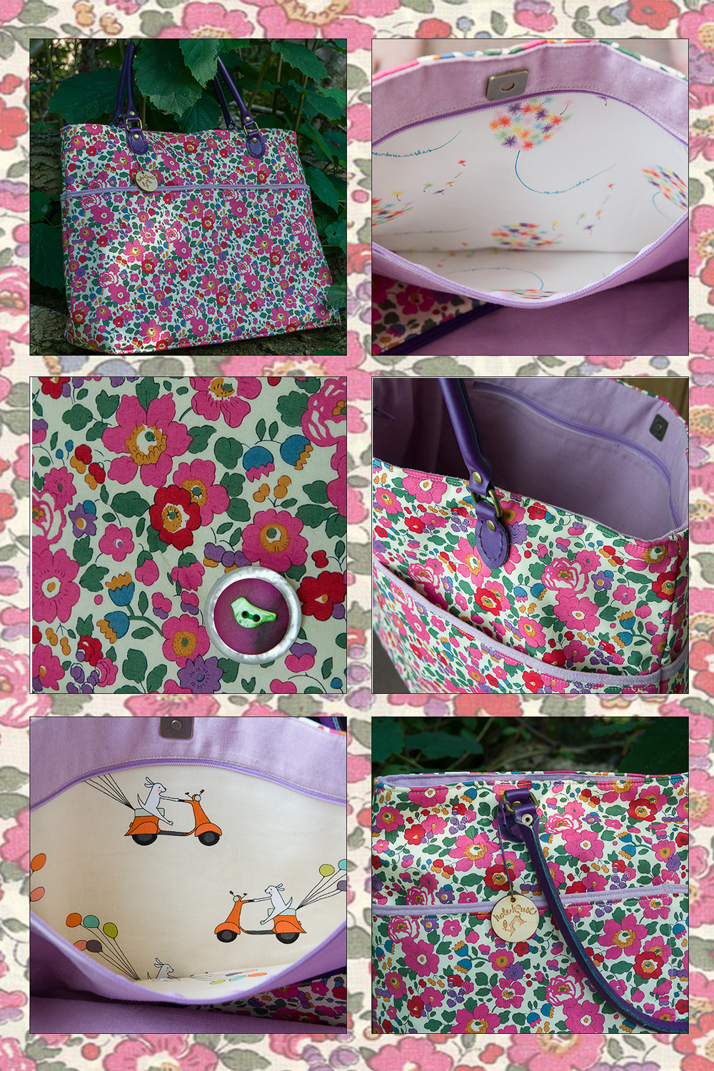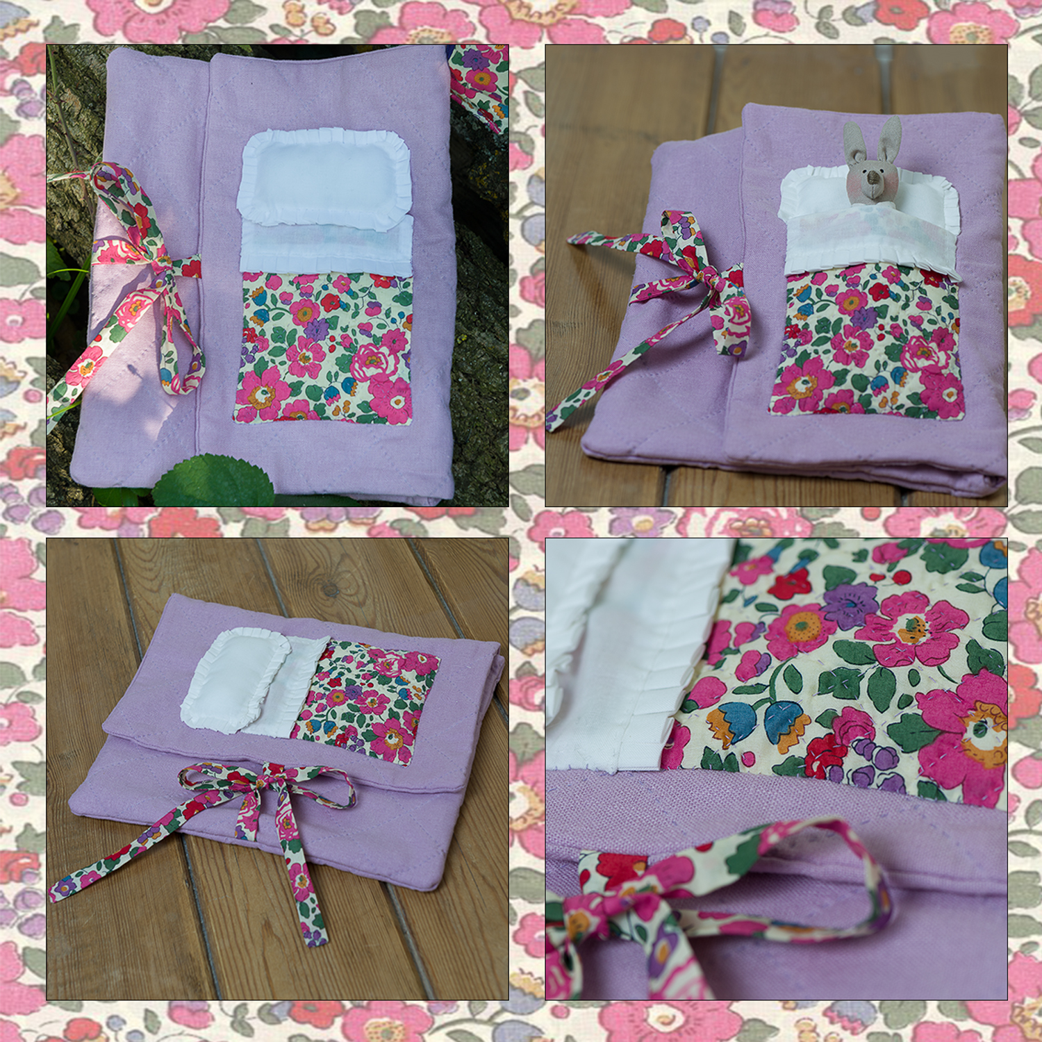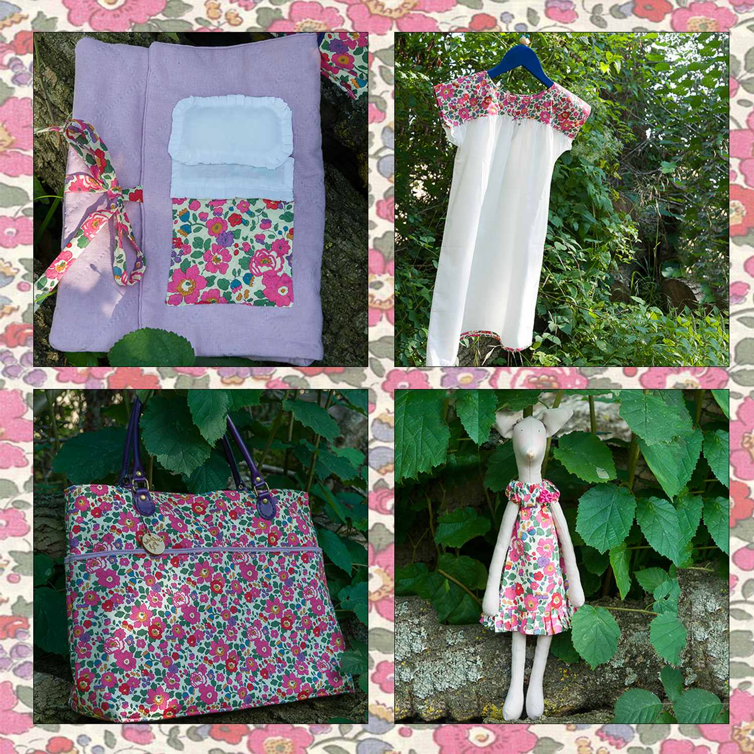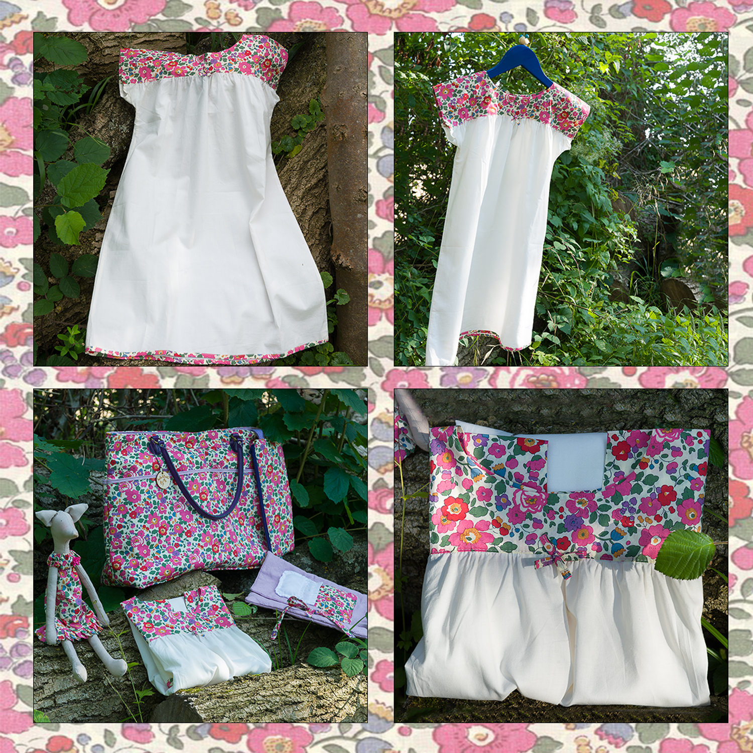 Each of the pieces features one of Liberty’s most popular tana lawn prints, ‘Betsy’, in pink, which we’ve accented with white and cream coloured lawns, and a plain lilac linen / cotton blend fabric.