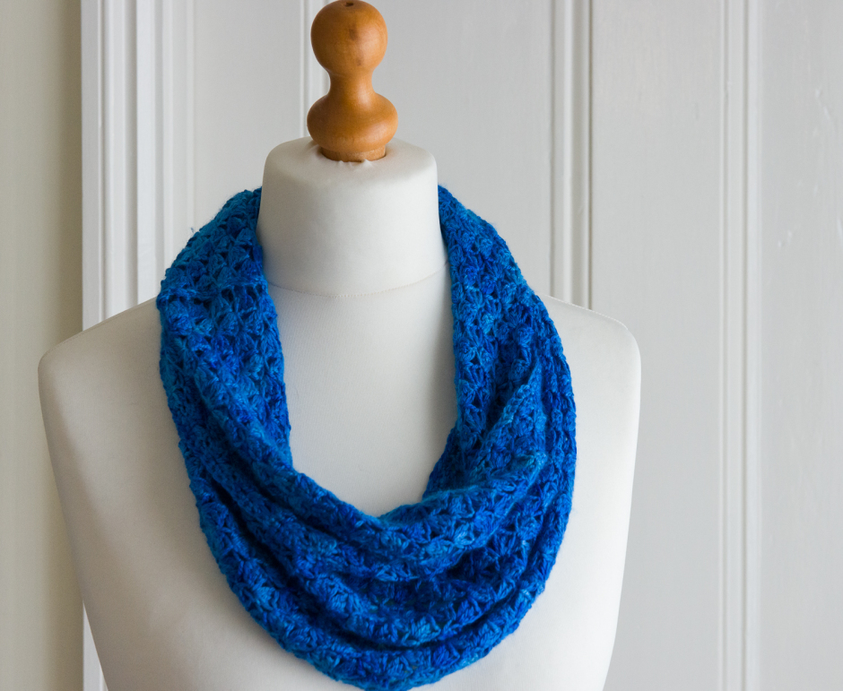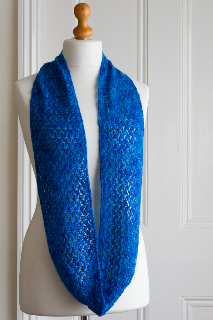 There have been three cowls completed in the last few weeks – one crochet and two knit. The crochet cowl is made with a cashmere and silk blend yarn and is the longer style that can be wound as short as you want to make it. I adore the blues of this hand dyed yarn – the colour is called ‘Bright Skies’, so that’s also become the name of the cowl:
