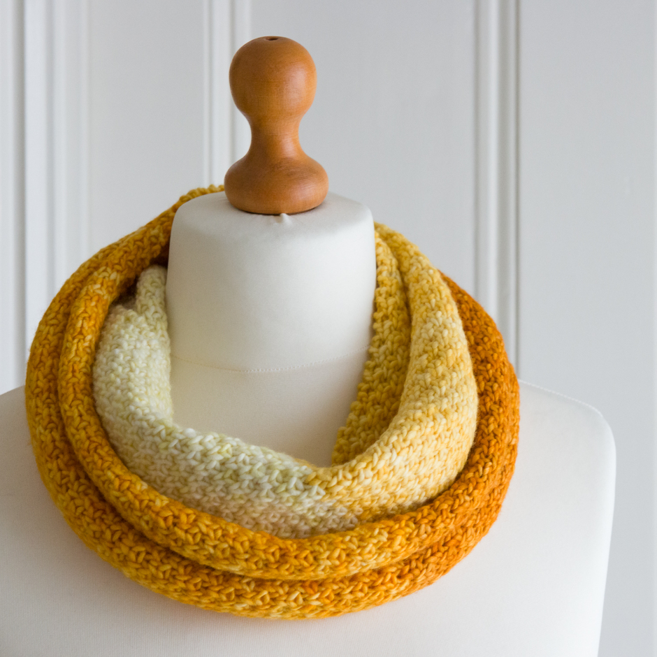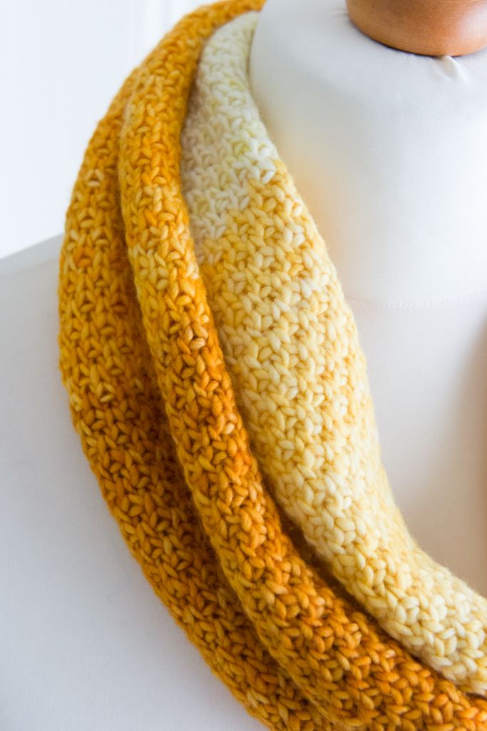 It was nice to work with Rowan’s Creative Focus Worsted again, although I was also happy to get back to my favourite Malabrigo Worsted Merino for my next cowl – a mini me version of the Shaded English Rose Tweed: