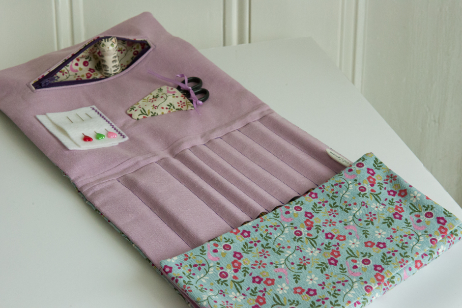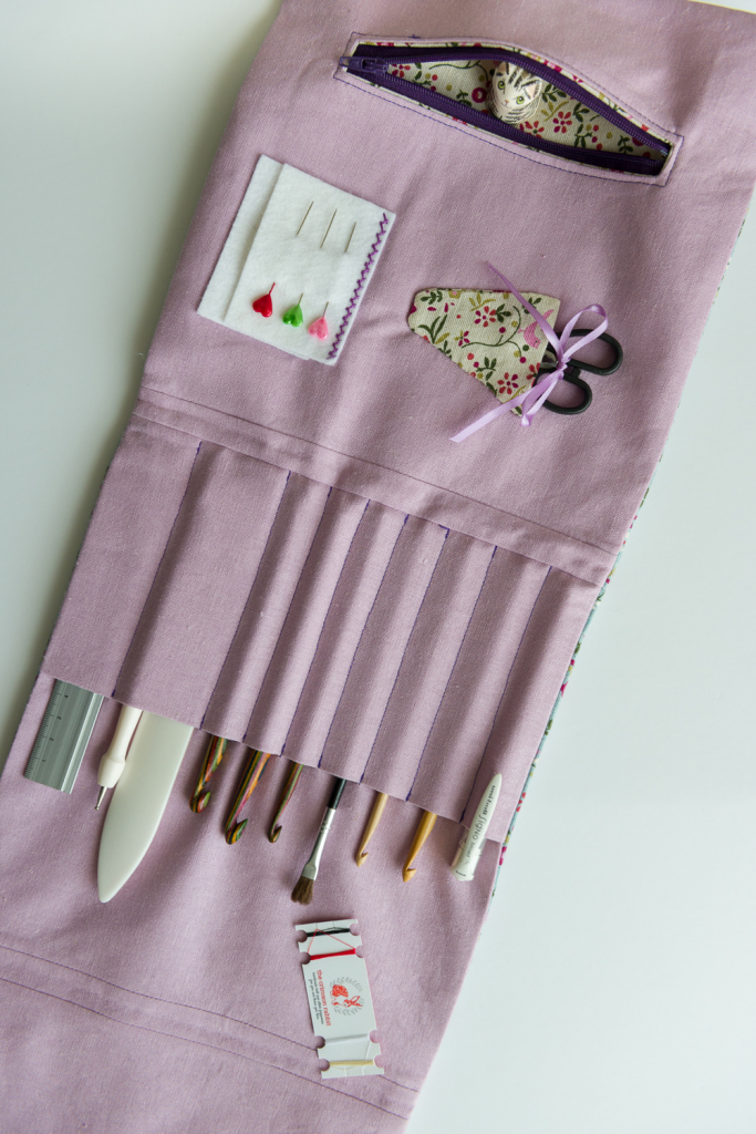 This actually went a lot smoother than I’d expected, as did making the little slip pockets you can see in the background where all the hooks and other ‘tools’ were set to go. I also thought about how the case would look and operate once it was loaded up with ‘things’ so decided to add a couple of fabric spines to the lining and the outer of about half an inch width, so that the case would fold easily at two points, without becoming all misshapen when full, which some needle and hook cases I’d seen seemed to do. I selected a medium weight linen and cotton blend fabric for the outer in a pretty print and interlined it with some fusible fleece to add some protective squish. The lining is also a linen and cotton blend fabric in a toning lilac colour, but in a lighter weight. I lined this with a medium weight fusible vilene, to add structure.