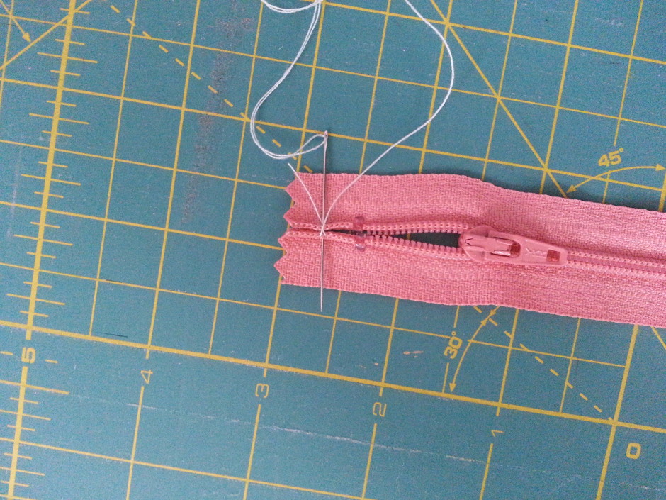 Before fitting the zip end covers to the zip, using a little tacking thread, stitch the top of the zip above the zip head closed (making sure you don't pull it too tight – it needs to stay flat and the little plastic stoppers need to stay aligned) to ensure that everything stays in place: