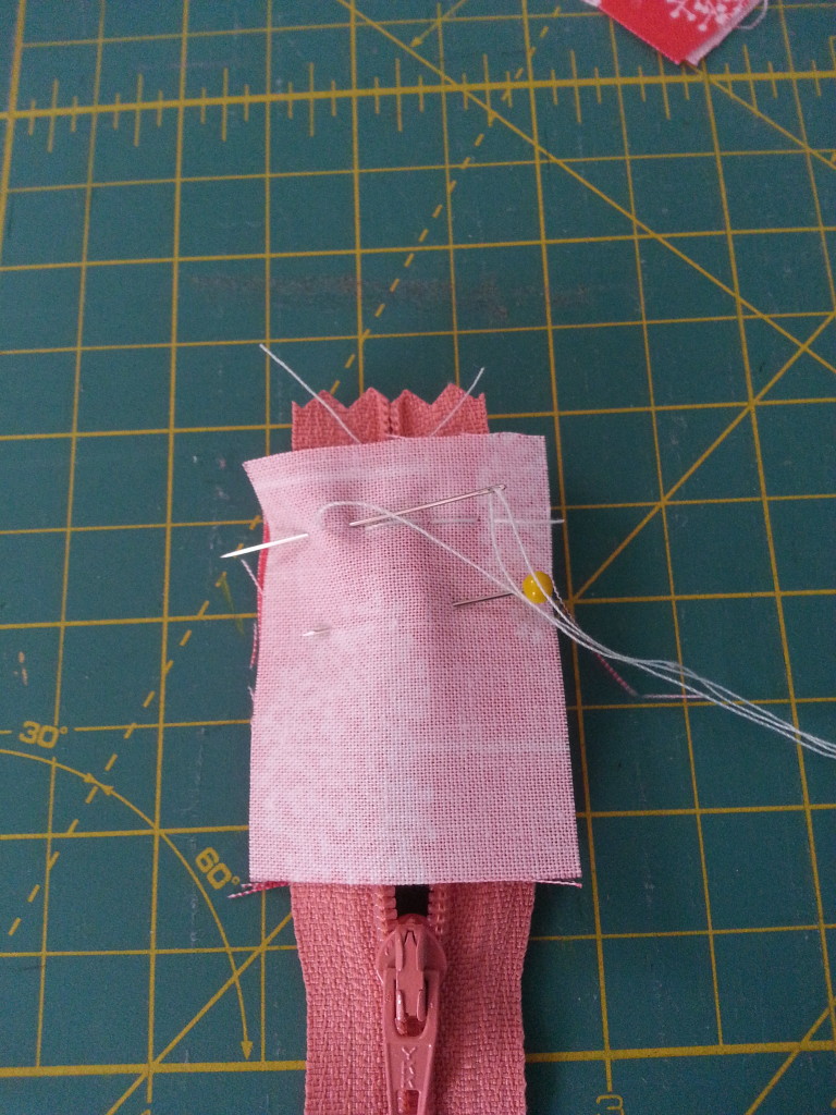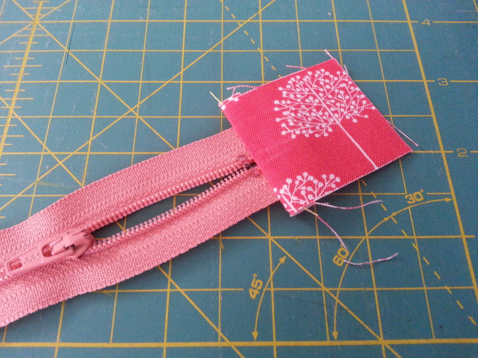 Now position two of the zip end covers over one end of the zip, with the right sides of the fabric facing the zip, and pin in place. You can now immediately sew the covers on, but I personally prefer to add a few tacking stitches just over the plastic end of the zip and remove the pin. This means that the work is nice and flat to sew on and that I know exactly where the plastic end of the zip is under the fabric, so I don't accidently sew over it and break my needle (have you ever done that? It's only happened once to me and John and we both needed an hour off and a pot of tea to recover):