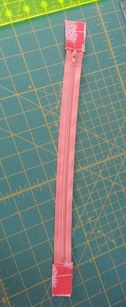 Give your top stitching a press to set it and trim off any excess from the zip end covers on each side: