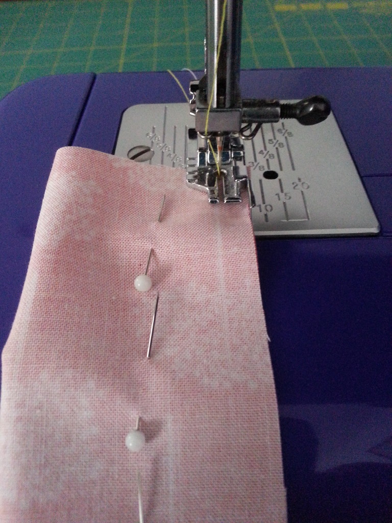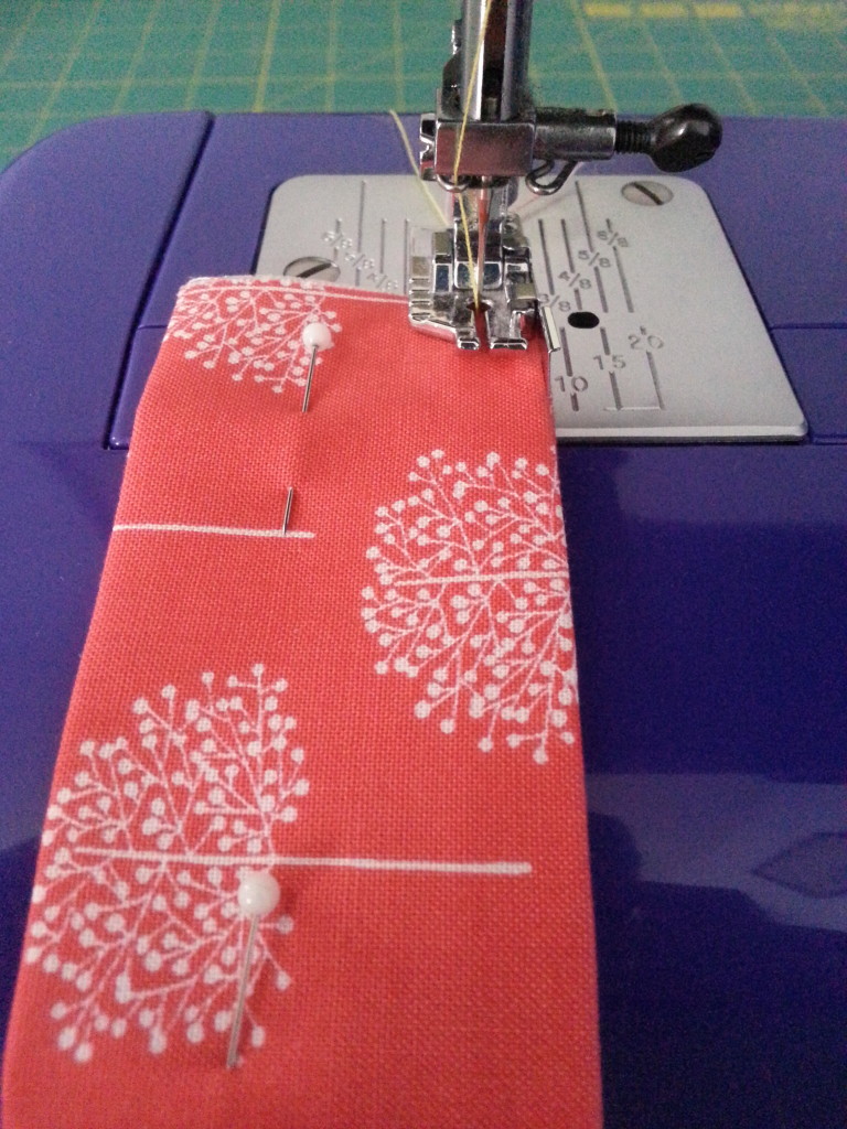 So, we're going to construct them by making little tubes that we'll turn out and top stitch. To make each one, fold the piece of fabric across the width, right sides together, pin and stitch along the open side using a quarter inch seam: