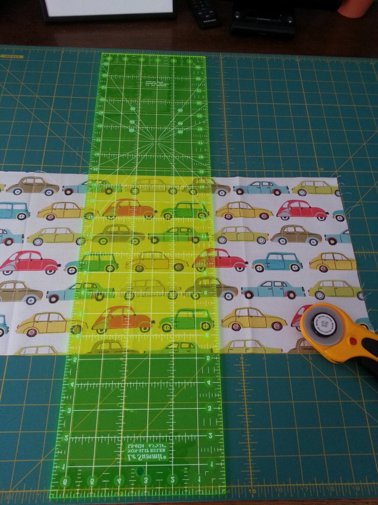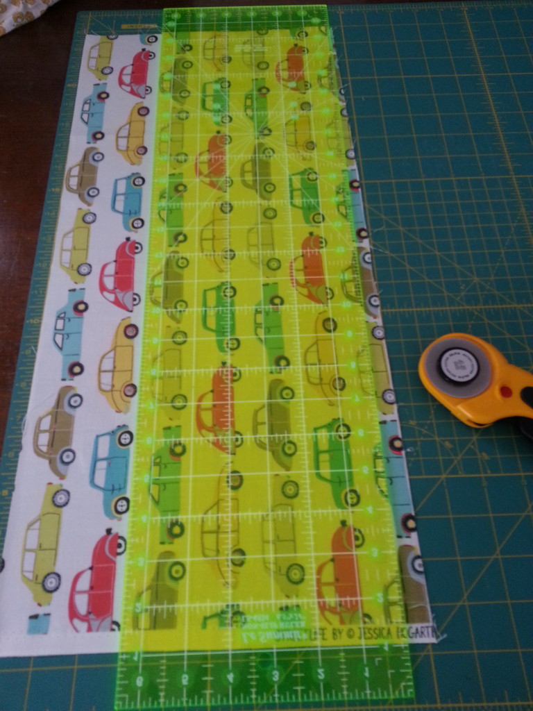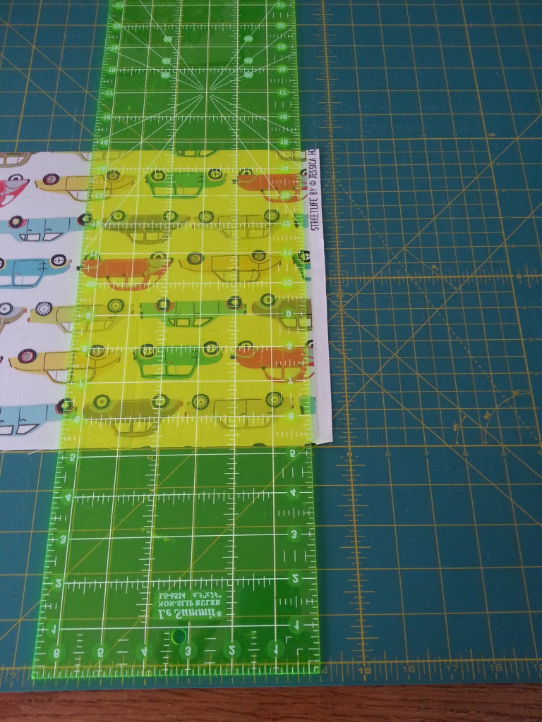 Making sure that the top edge of the fabric is over the vertical '0' mark to the left of the mat, cut across the width at 9.5":