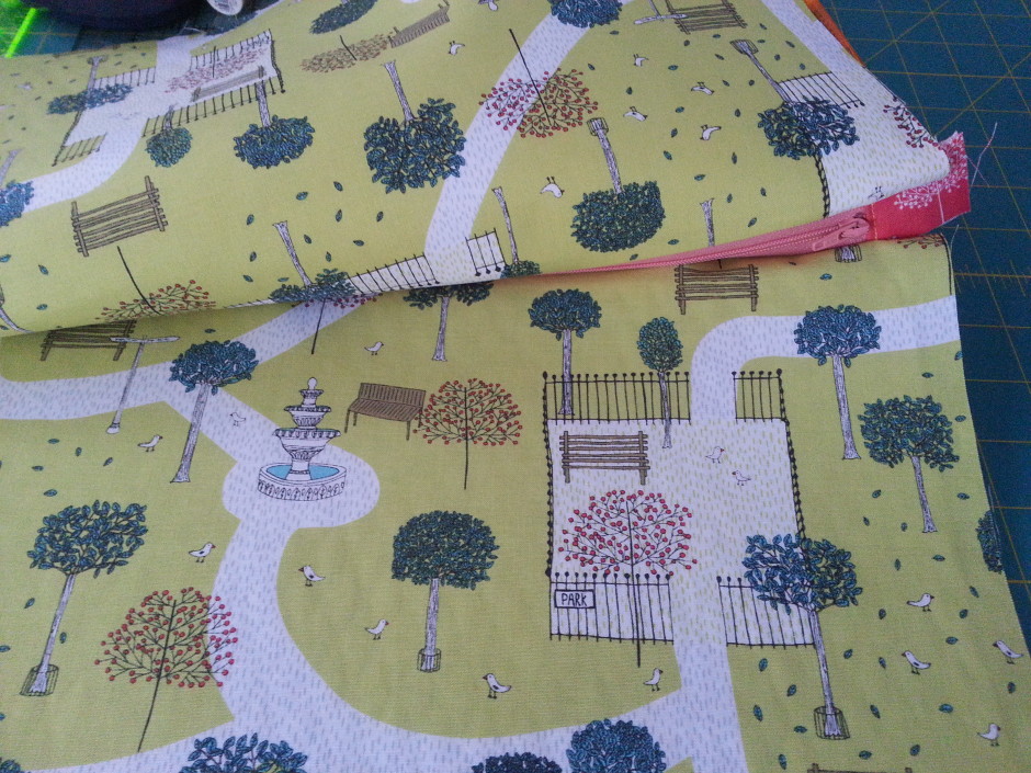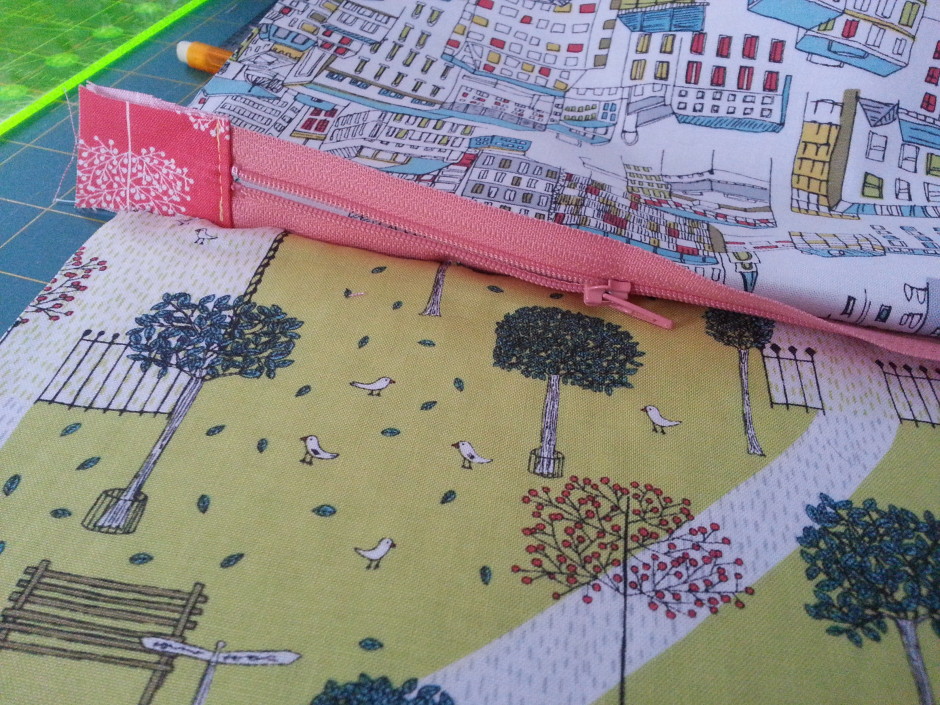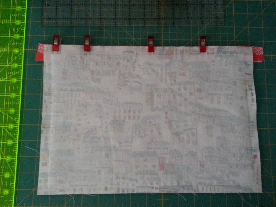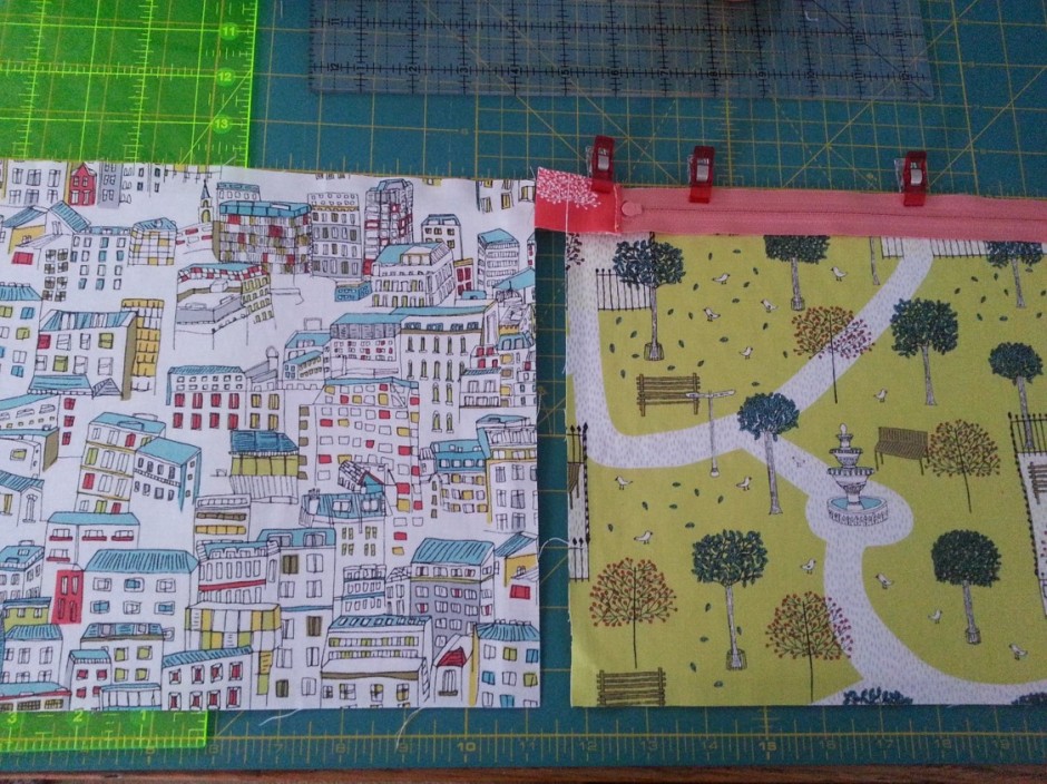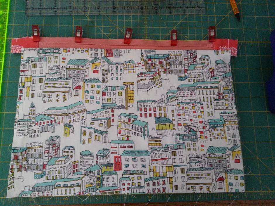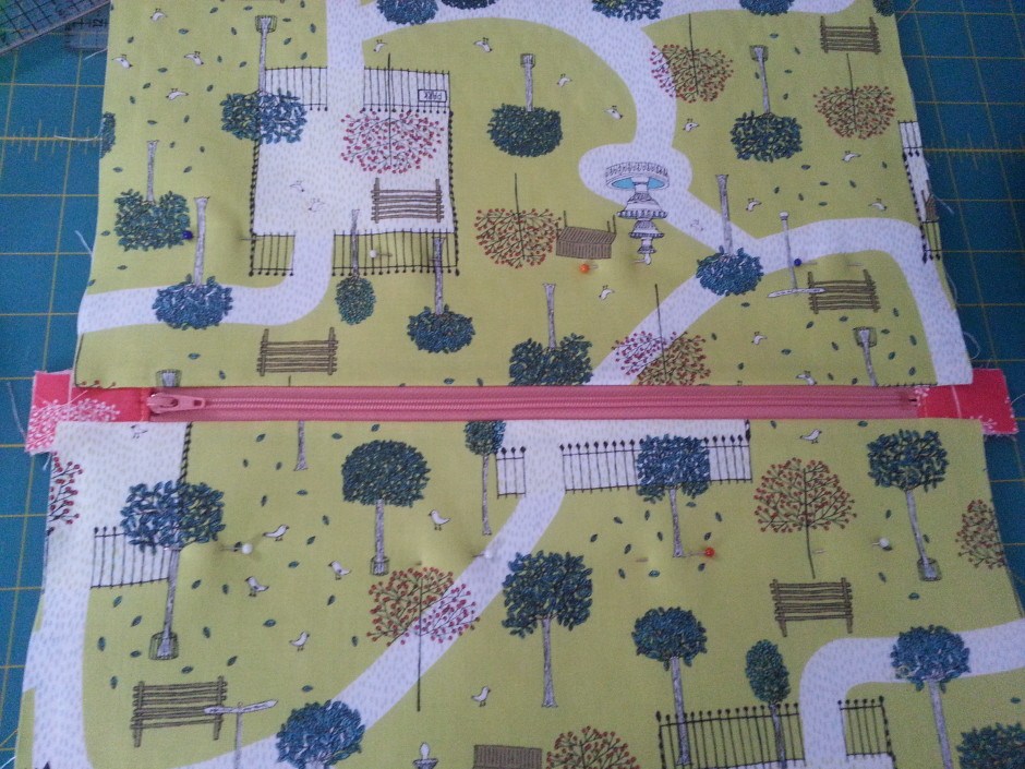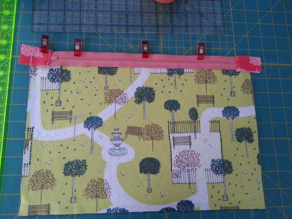 Take the lining piece without the pocket and making sure that the top of the print (if it has one, as this one has) is at the top, and that the edges of it line up with the edges of the outer piece underneath, lay the top edge over the zip and clip into place: