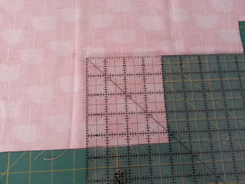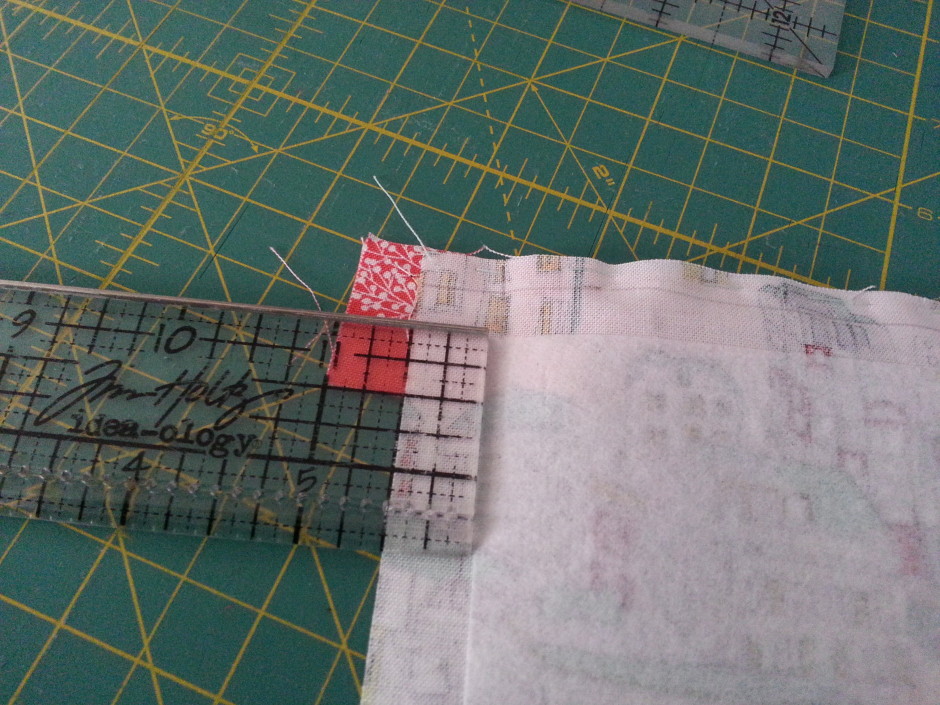 Now put you're newly cut vertical edge on the 0 of the mat and trim off the selvedges at the 14" line: