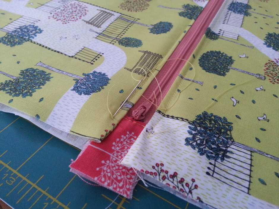 For those who are very confident machine stitchers, you can probably skip this next part, but if you like your sewing to go super smoothly as I do, you might now want to take your tacking thread and a hand sewing needle and tack all three layers of the outer, the zip and the lining together along the very top edge: