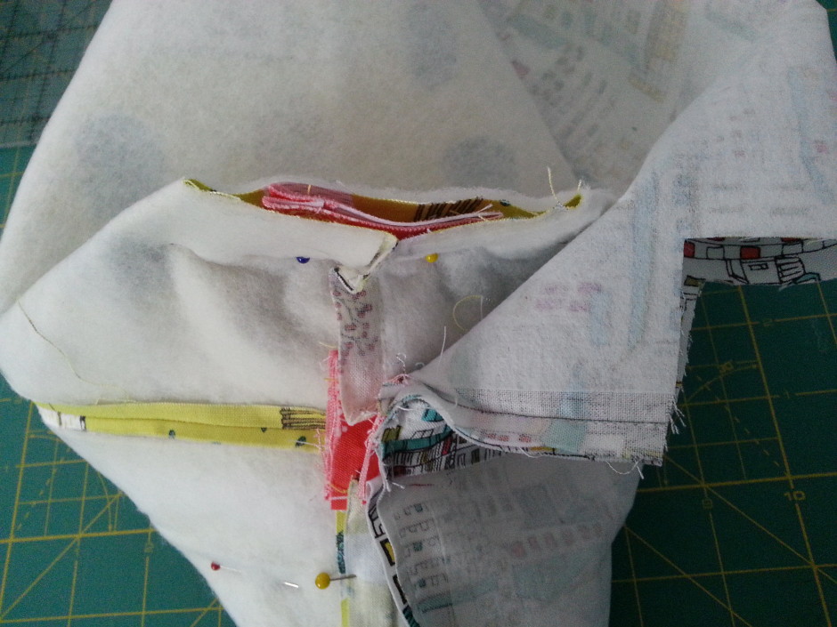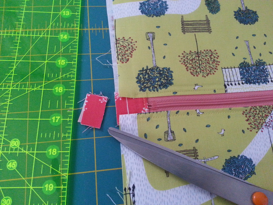 Time to work some magic and make this look like a bag by turning it out through the hole you left in the lining bottom seam but, just before that, check your edge seams and clip out any bulk you don't need around the zip: there really shouldn't be much but you might have a bit of the edge of the pull tabs that could be trimmed: