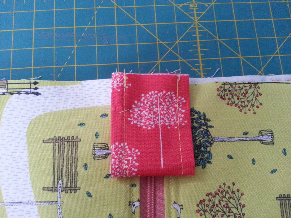 Next we need to get our pull tabs into place. Take a tab, fold it in half lengthways and place it right side down on the zip, with the fold facing in. Pin it in place and add a few tacking stitches to keep it there so you can lose the pin (avoiding bulk again!). Position the other tab at the other side, in exactly the same way: