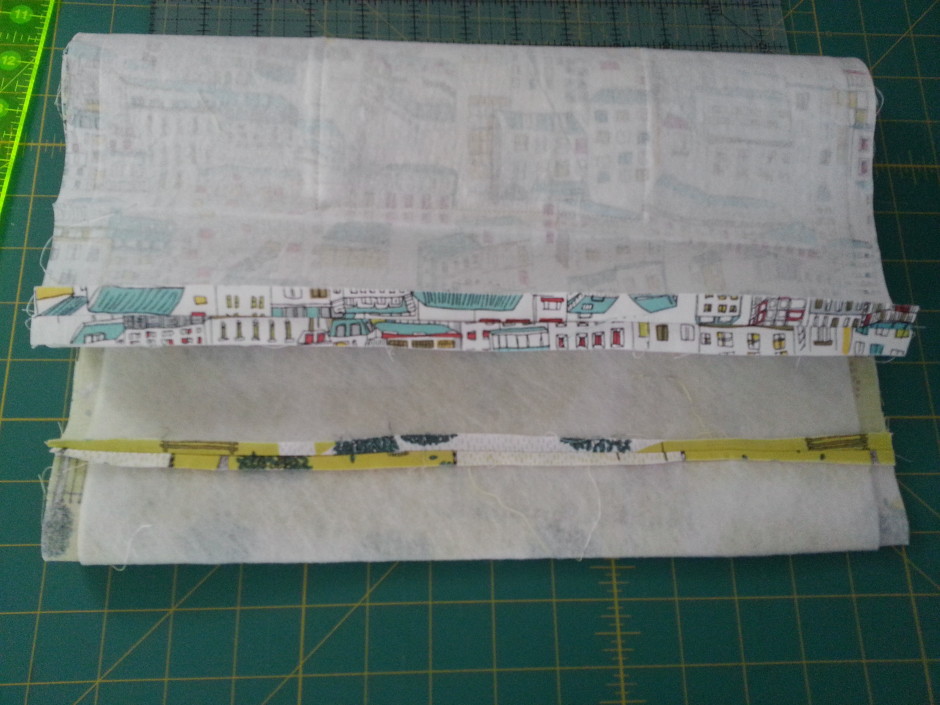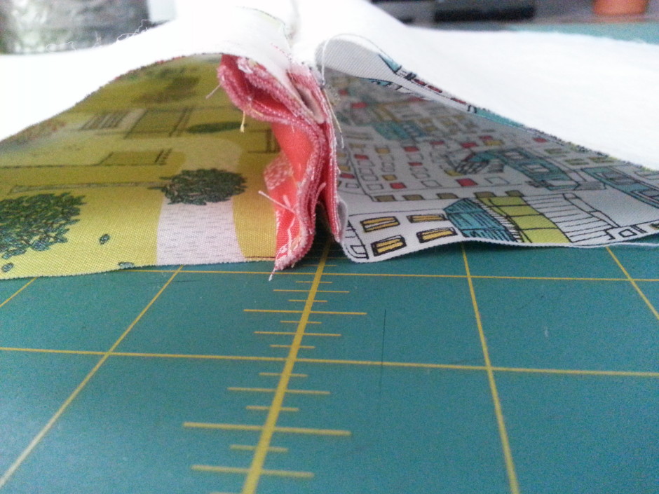 Seam the outer parts together using a quarter inch seam, and the linings using a half inch seam (we want the lining to be a bit smaller than the outer so that it fits tidily into the bag). When you sew the lining seam, leave an opening of 3 to 4 inches that we'll use to turn everything out through later on. Open up both of the seams and press them open with the tip of your iron, making sure that you cover the fleece and interface with your pressing cloth so that you don't mess up your iron: