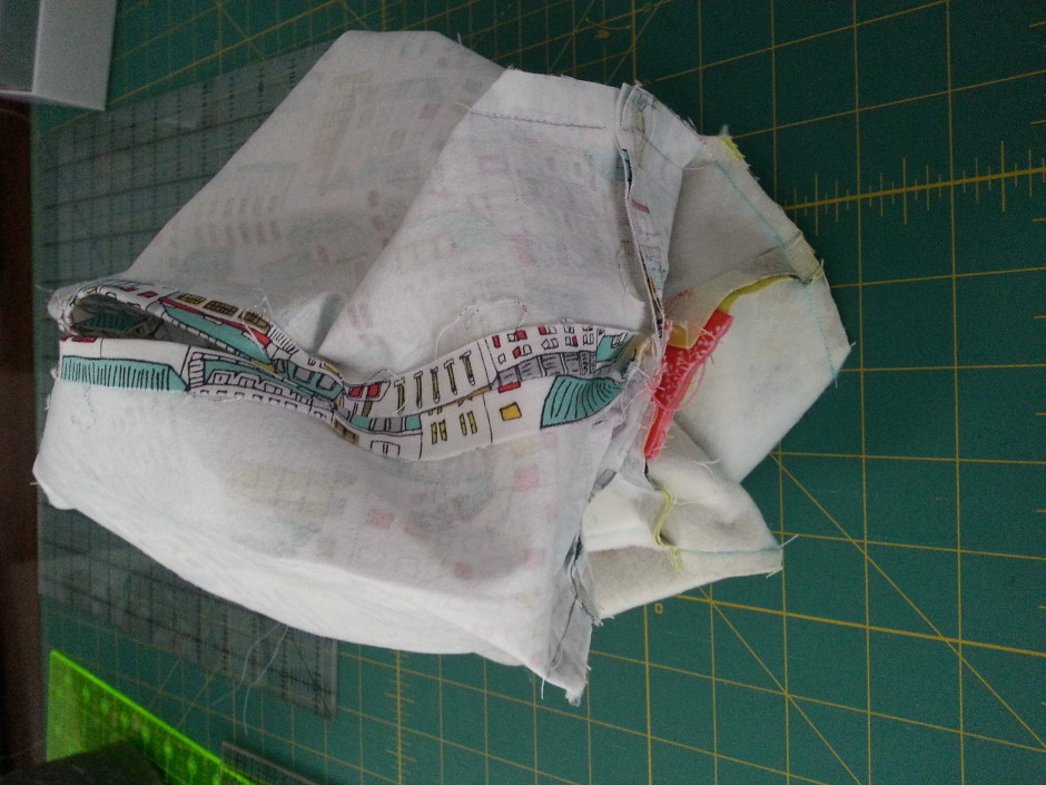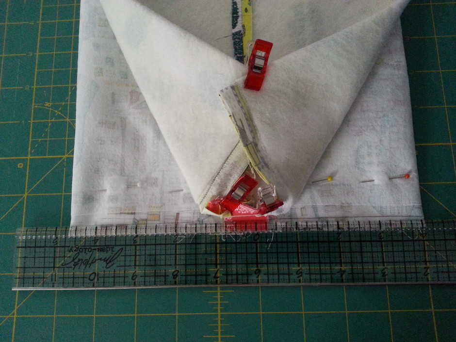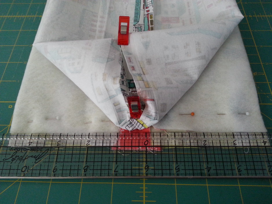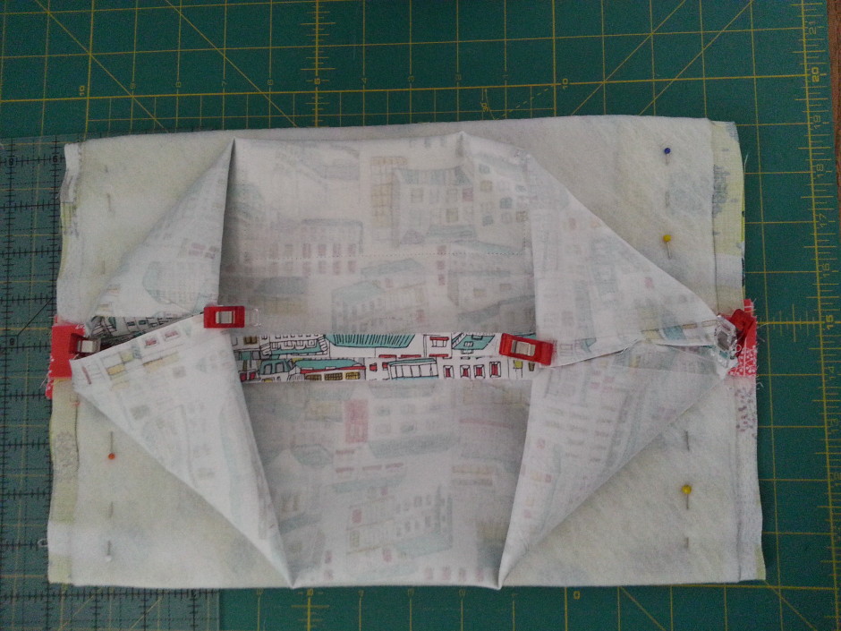 Pull the other end of the handle (make sure it isn't twisted) through the opposite corner hole, centre and pin that in place too. There's a good double check that you've got things the right way around in this picture – the open, stitched side of the handle is facing down towards the bottom seam of the outer, which means it is the right way up: