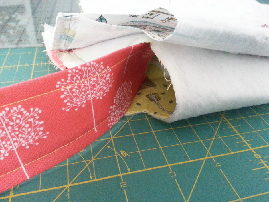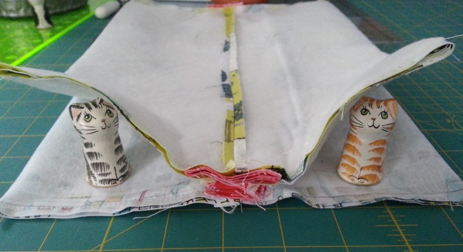 Once all four of your side seams are sewn, this is how the sandwich looks from one side (thanks to my glamorous tabby assistants):