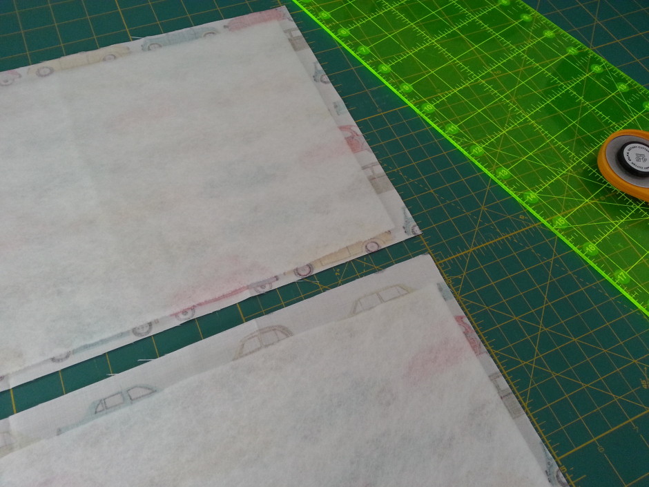 Cut two pieces of fusible fleece to 13" wide by 8.5" high. We're making these smaller so that we don't clutter up the seam allowances, or the area where we're going to put the zip, with unwanted extra bulk for your sewing machine to cope with. Lay the fleece pieces onto the wrong side of the outer fabric pieces, making sure that the fabric is thread and lint free and that the fleece is glue side down onto the wrong side of the fabric (you can feel the nubbly texture of the glue with your fingers, if you aren't sure which the glue side is). You can see that I've placed my fleece so that the top edge of the fabric where the zip goes is free of fleece by a good half inch: