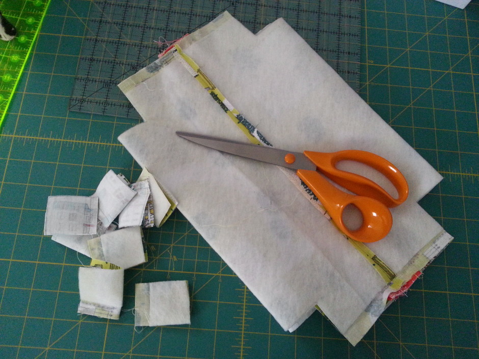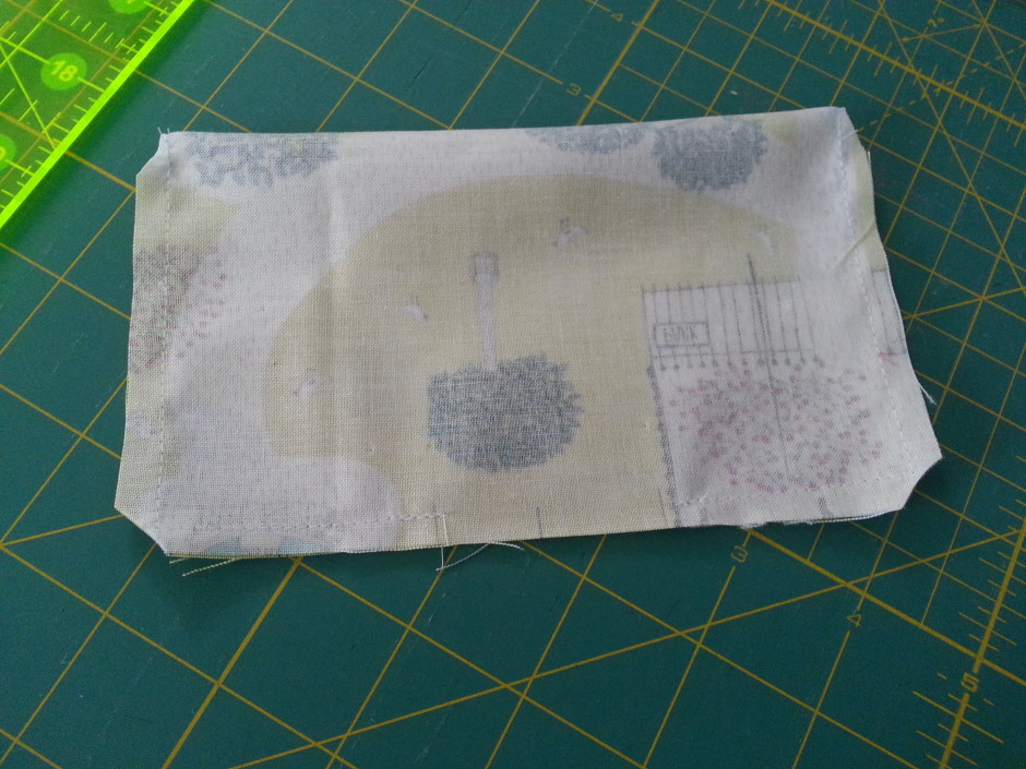 Now, using a quarter inch foot, seam it all around the 3 sides, leaving a small turning gap in the bottom seam. Trim the corners to get rid of any fabric bulk and ensure clean angular corners when turned out: