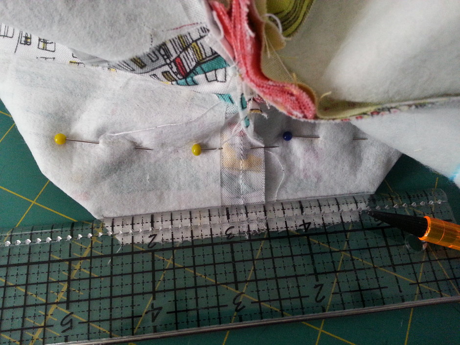 Let's work on the outer part first. Bring the edges together and pin them so they don't move about. Then clip the lining parts of the bag out of the way and mark a half inch seam line on the outer sections: