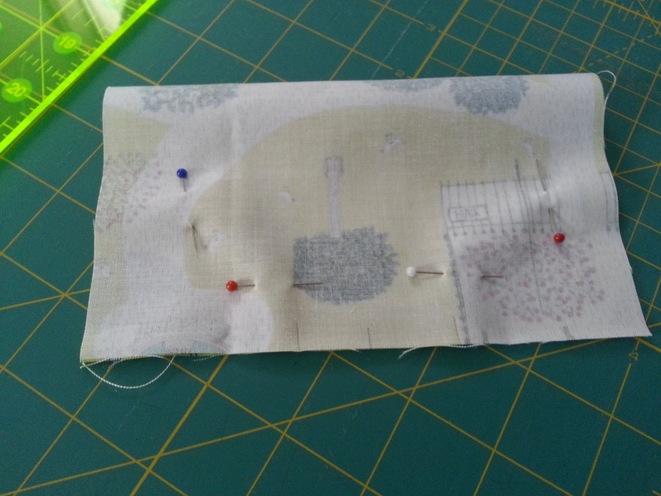 To make the simple slip pocket for the inside of the bag, grab one of the offcuts from the outer FQ and cut it down to 7" high by 6.5" wide. Fold it right sides together across the height and pin it all around:
