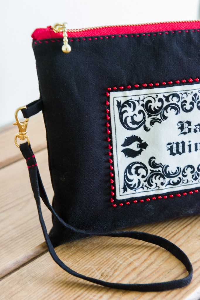 I used black Essex linen for the outside and of course it needed lots of hand stitched detail to make it special, like the top stitching, the hand applique and hand beading on the front and back. I even invisibly hand stitched a super slim wristlet loop:
