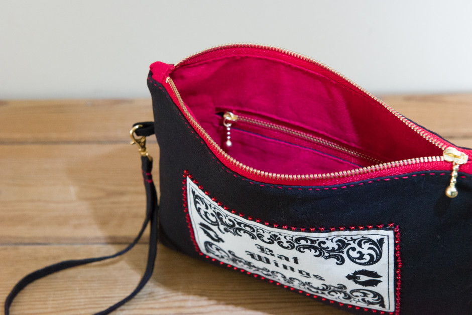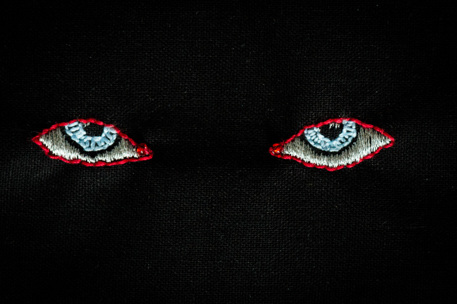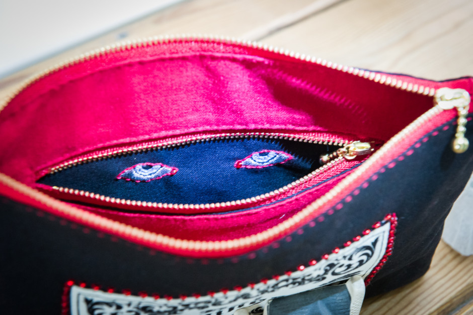 Unzipping the pocket leads to a bit of spooky embroidery, which I based on Kate Beckinsale's vampire eyes from the Underworld movies. This would be a great place to keep cash – anyone opening the pocket will be too scared to take anything 😀